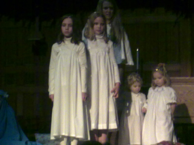 As for tradition, this year Claire was uncertain about the pageant. She’s nine and a half, on her way out the door of youthful unself-consciousness. It’s not cool anymore to be an angel wearing a garland of gold stars, but she did it. Probably her last gig with the heavenly hosts. She glanced around somewhat indifferently as shepherds came and went, as Wise Men plopped down fake gold and faux frankensense. But I watched her, more sure than ever that she was a divine being. That we all dance in holy light.