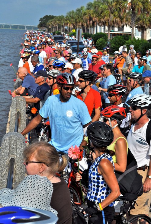 We gathered early last Saturday at the site of old museum ruins. First maybe 70 of us, then 100, before long 500. We rolled down the stately streets of Charleston on various versions of two wheels — some on tricked out carbon-frame Treks, others on garage-dusty clunkers, the wee ones on training wheels. Actually, we all wobbled on training wheels, as we tried to find balance on the hard pavement of grief. We rode in mourning, and in celebration, and in our wake, silence. No rattle-hum of car engines, no whizzing by of SUVs. The streets were ours, and Edwin’s, for a short 2 mile jaunt on a steamy weekend morning. When we met up with the rowers out on the water, bidding their shipmate a traditional mariner’s farewell, we tossed lilies and gerber daisies on the harbor. A floating bouquet that stretched the length of the Battery. I’ve never seen anything like it.