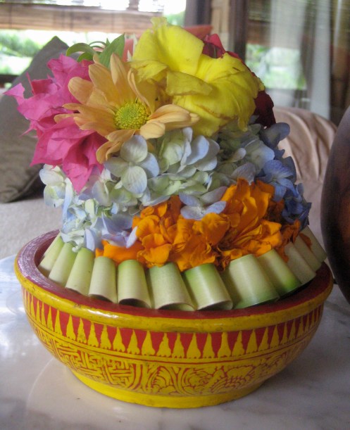 It was 3:30 before I crawled under the mosquito netting the night before, so my body buzzes as it re-calibrates time zones, thirty hours of flight, the damp, fragrant air.  I sit and sip as long as the banana frosty holds out, watching barefoot women on the grass weave fronds and blossoms into altar offerings, wondering when the rest of me will show up.