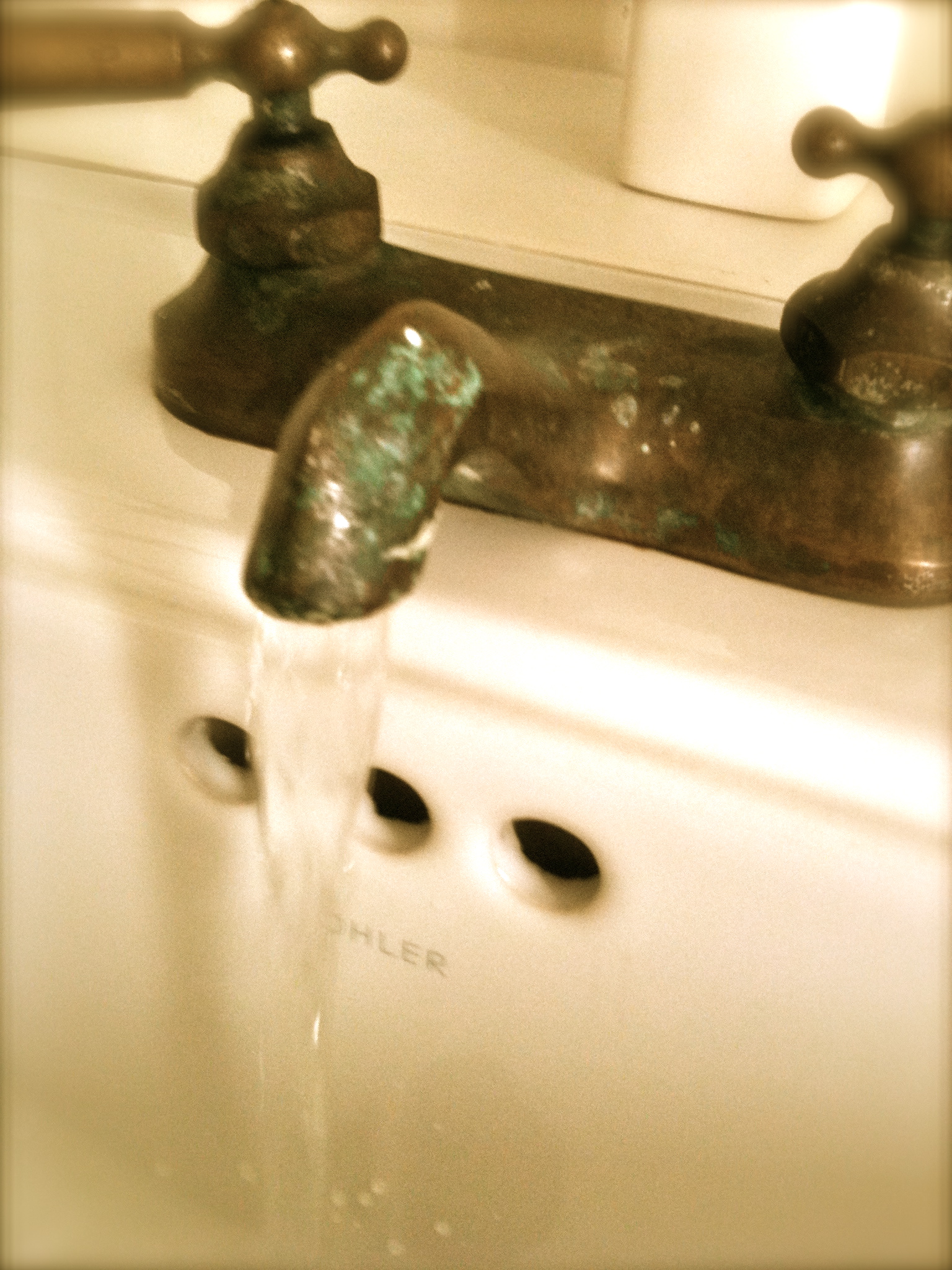 Drenching, warm, timeless, slow: this moment fills. I am waiting for Mohammed in the winding streets of Fez to make his long, deliberate ablutions before each meal: water and prayer as one. I am standing beside a six year old in the Atlanta airport who stretches tip-toe toward the lavatory stream, singing. I am touching moistened fingers to a baby’s head while the baptismal rite gurgles from my mouth; kissing my husband’s chlorine-pickled flesh, still damp from his morning swim. I am ten, standing beside my father in church, belting out, Come Thou Fount of Every blessing . . . I am splashing in the sink with my father’s hands.