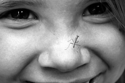 Claire, sporting a baby praying mantis (in lieu of a snail)
