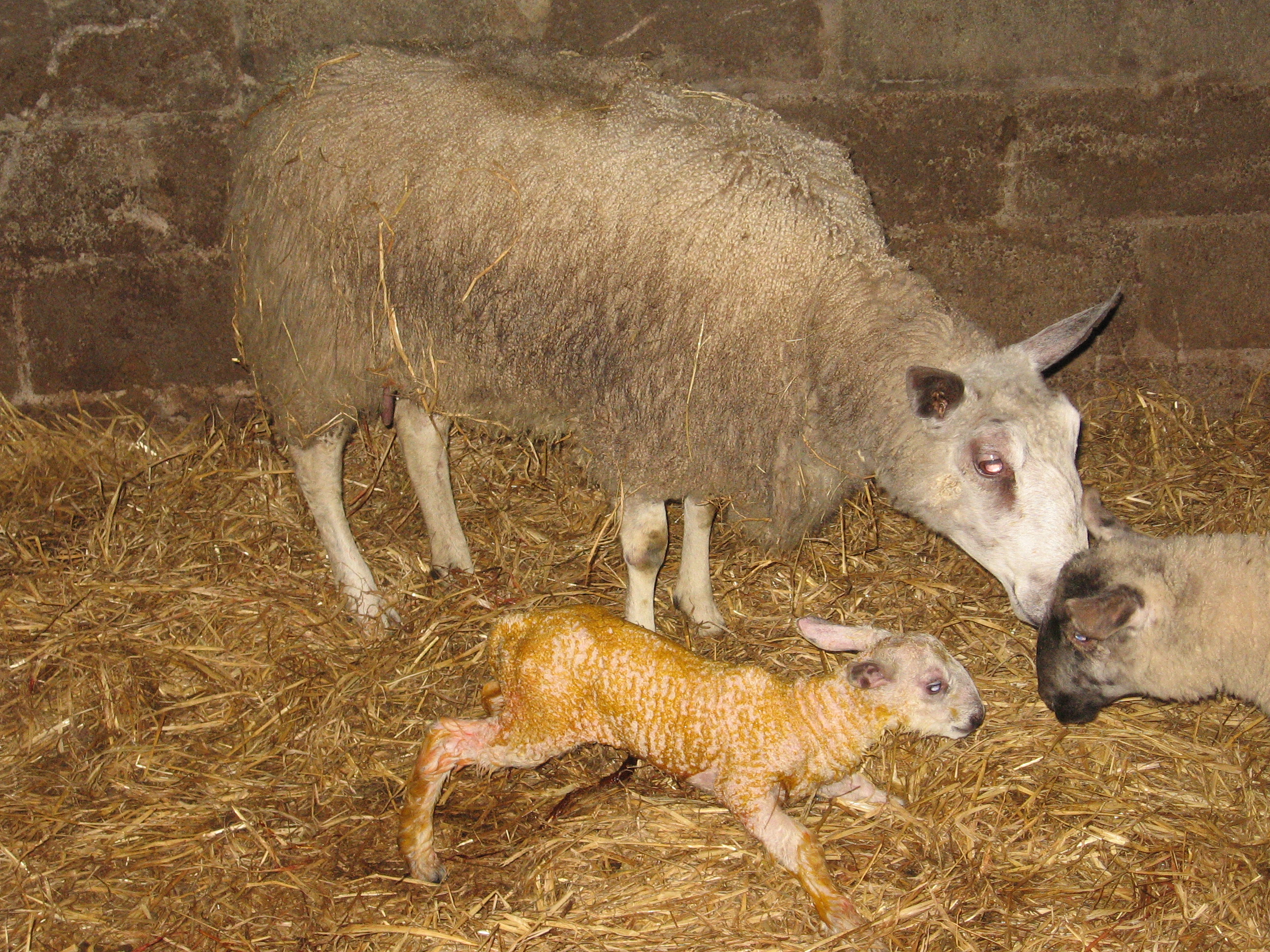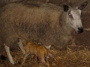 We ran up to the house to give Joyce and Bert the news, Doz put logs on the fire and Joyce dipped up plates of roast turkey & gravy, roast potatoes, roast parsnips, balls of dressing, sausages wrapped in bacon, carrots, beans, new potatoes, and broccoli. Doz had cleared his plate before we were half through, trotted off back to the barn, and returned a few minutes later to say that the ewe had had the first one, which was—unfortunately for him—a female (he’d planned on this one being a prize ram). I couldn’t get my Wellies on fast enough. Bert joined us this time and brought his camera.