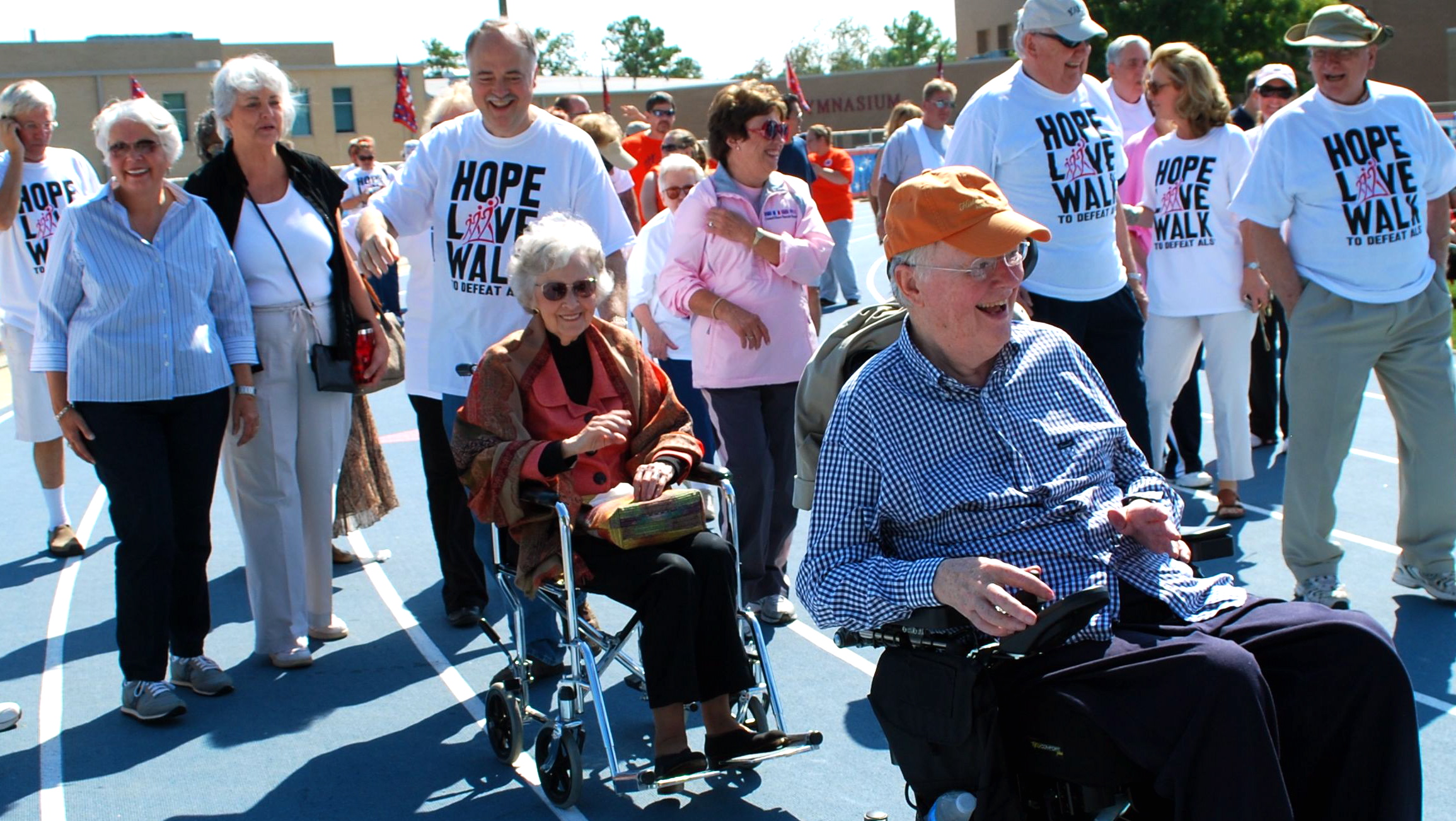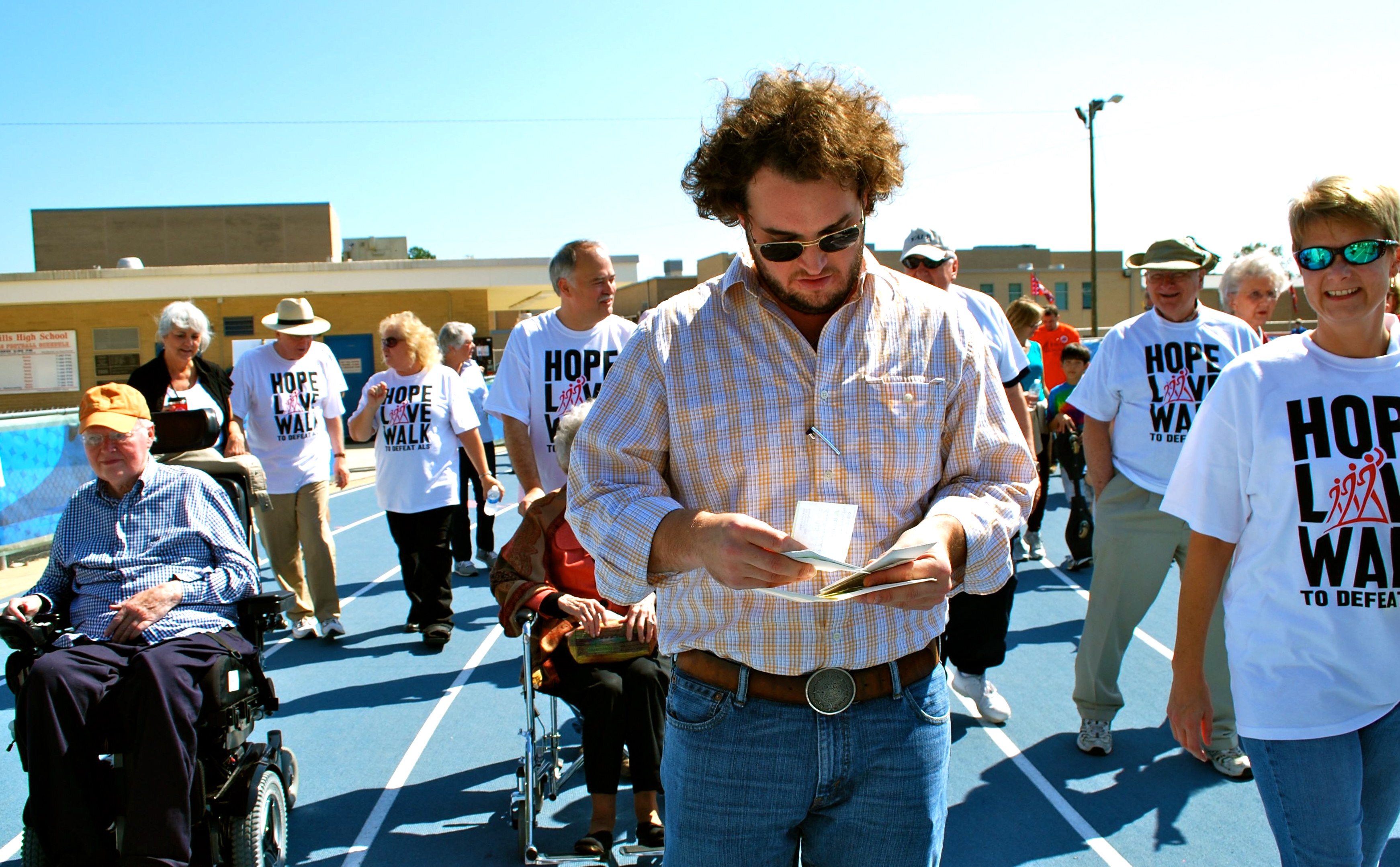 Around our huddle, a larger crowd streams in.  Wheelchairs are common, and those in them uncommonly still; friends navigating their passage.  It is the Alabama Walk for A.L.S.